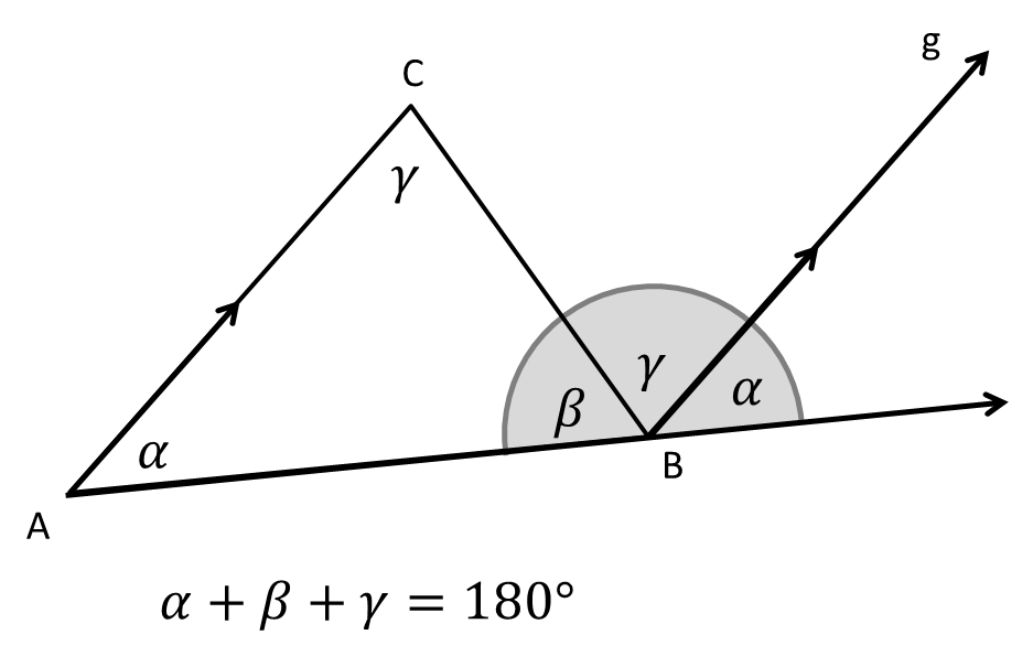 Terlihat bahwa sudut α, β, dan γ membentuk sebuah garis lurus, yang besarnya tentu saja 180°.