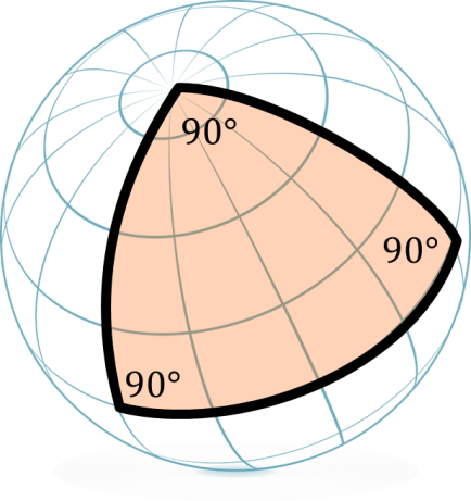 Bayangkan kamu bergerak dari ekuator ke kutub utara. Kemudian kamu menghadap kanan, lalu meneruskan perjalanan hingga sampai ke ekuator, menghadap kanan lagi, berjalan lagi, hingga kembali ke titik semula. Di titik semula itu, kamu menghadap kanan kembali untuk menghadap utara. Karena yang kamu lakukan adalah menghadap kanan, berarti sudut-sudut yang kamu buat semuanya adalah 90°, yang berarti segitiga itu memiliki jumlah sudut 270°. Sesuatu yang tidak mungkin terjadi pada bidang datar.