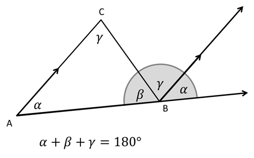 Masih ingat dengan pembuktian proposisi 32b geometri Euclid? Di sana telah dibuktikan bahwa jumlah sudut dalam segitiga adalah 180°.