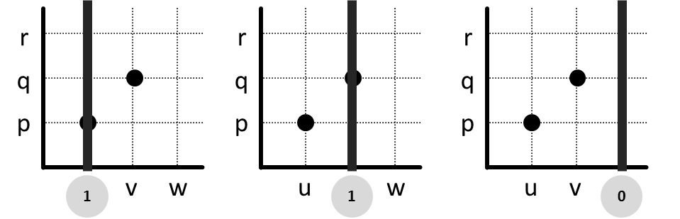 Mari kita kunjungi setiap anggota domain, yaitu u, v, dan w, menggunakan garis vertikal. Ternyata sewaktu kita mengunjungi w, garis vertikal tidak melewati titik sama sekali. Berarti relasi ini tidak total kiri.