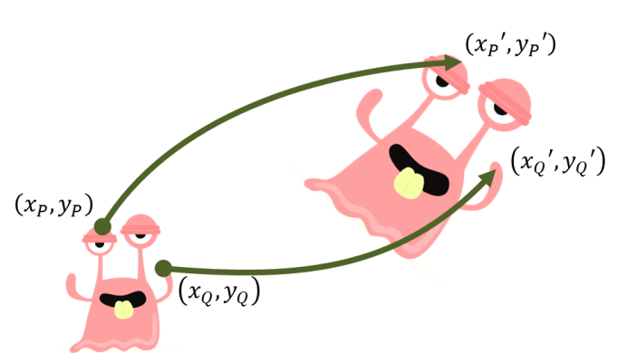 Setiap titik pada gambar monster di sebelah kiri dipindahkan dengan aturan tertentu. Hasilnya, setiap titik yang dipindahkan akan membentuk gambar monster yang baru di sebelah kanan.